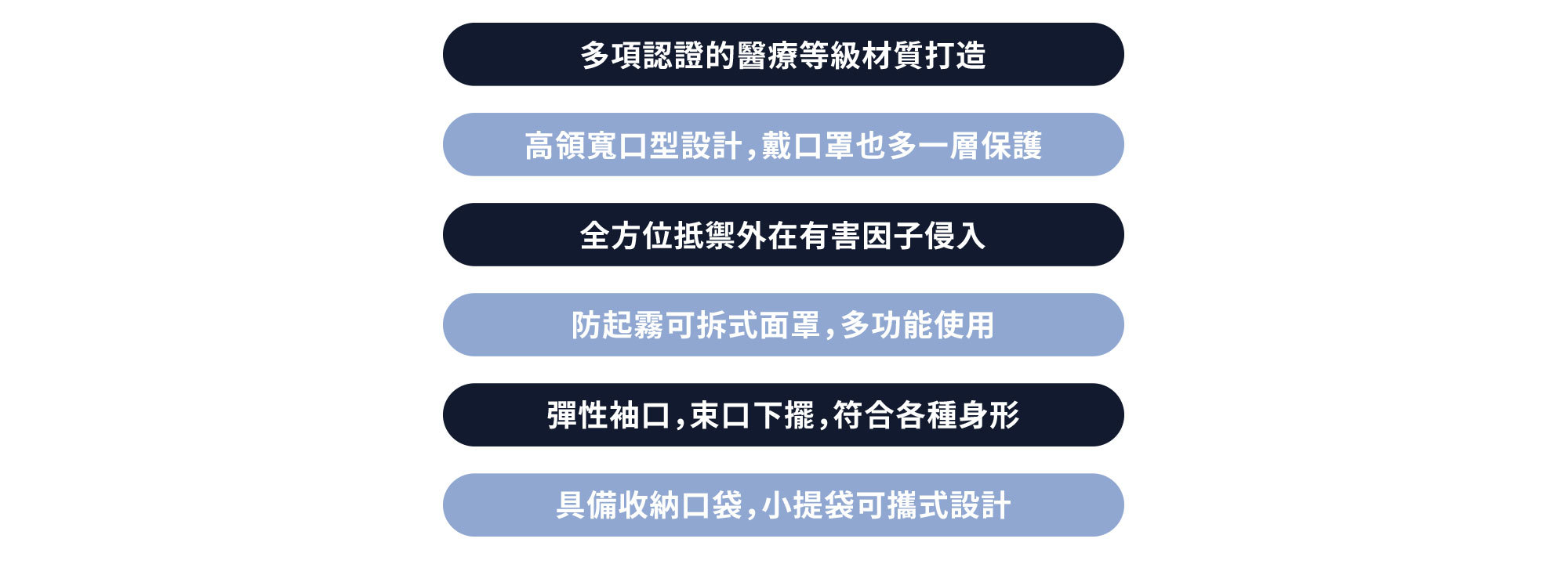布料規格已達到醫療等級,符合美國醫療等級 AATCC Level 3 之標準,並通過歐洲最高等級EN14126:2003/ ISO 16603 抗合成血液與 EN14126:2003/ ISO 16604 以Phi-X174噬菌體大小0.027um做穿透測試,經三次重複測試均通過檢測並無穿透,有效阻隔有害因子入侵,不同於市面上一般機能夾克材質,更具備了舒適柔軟,防水透濕的特性,長時間穿戴也不悶熱。